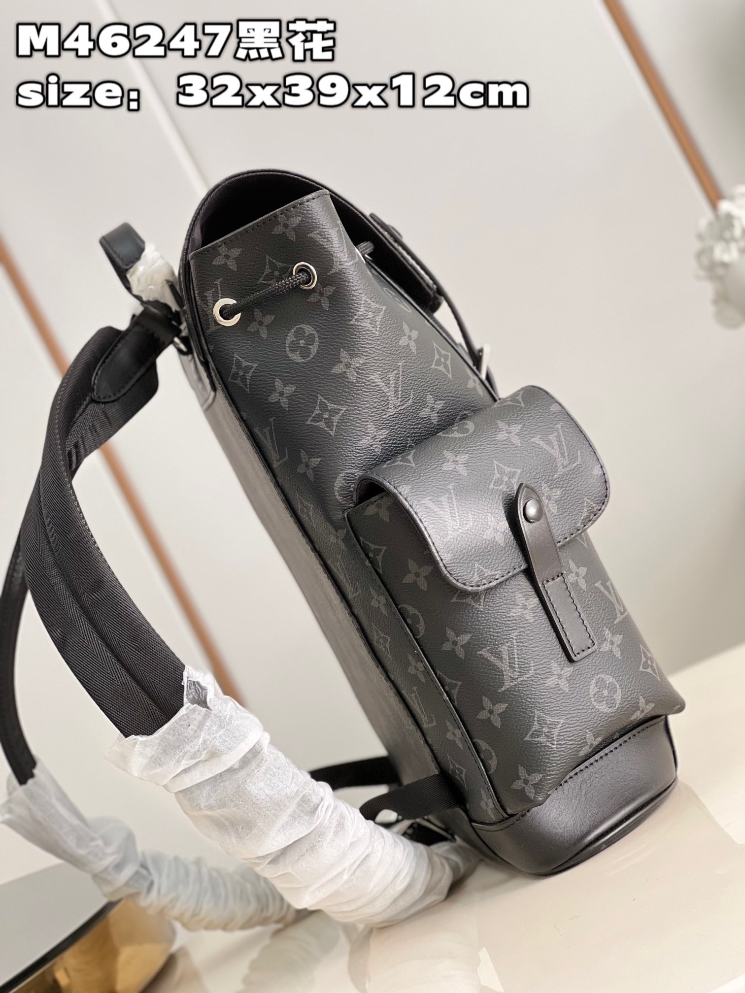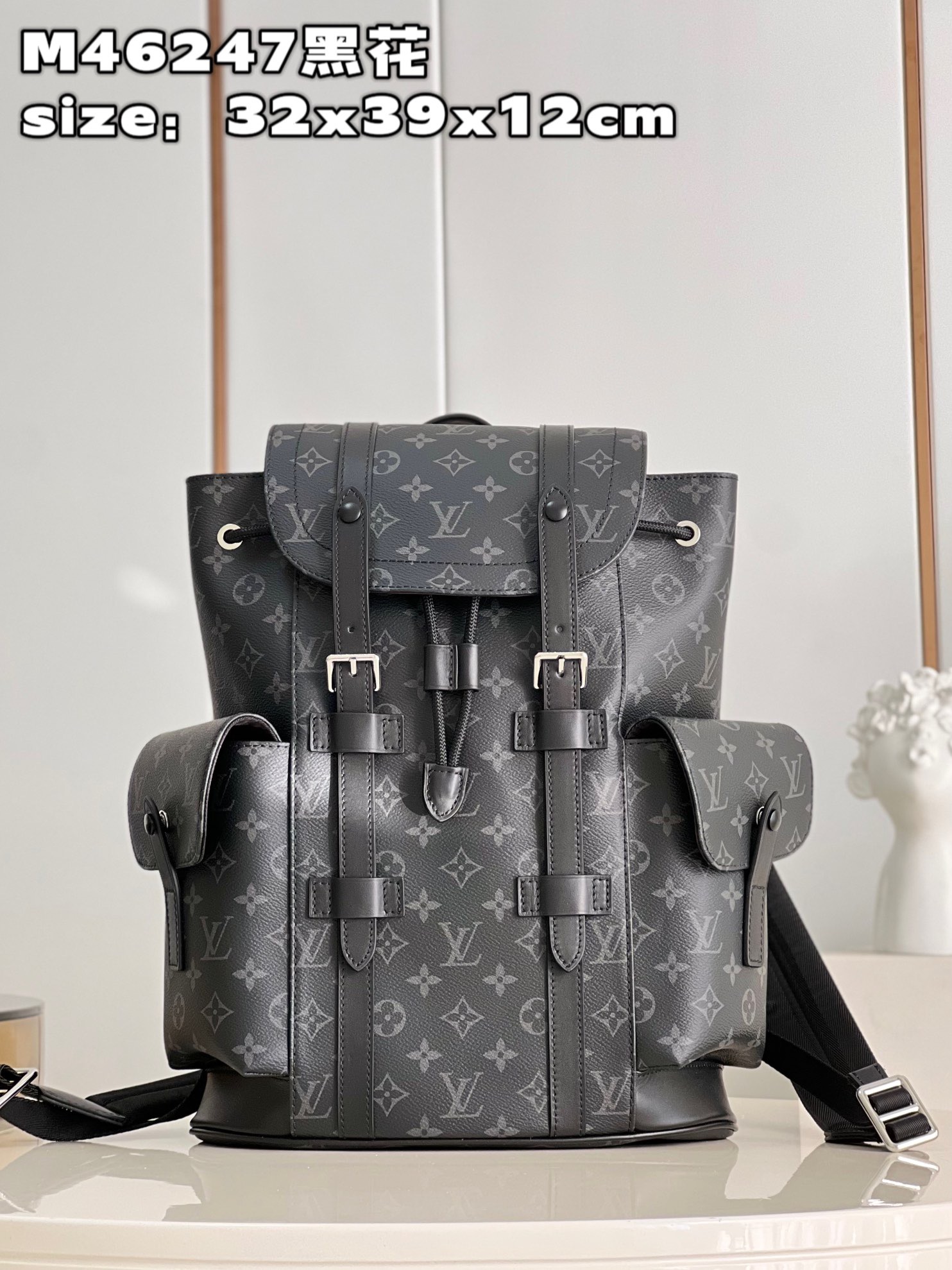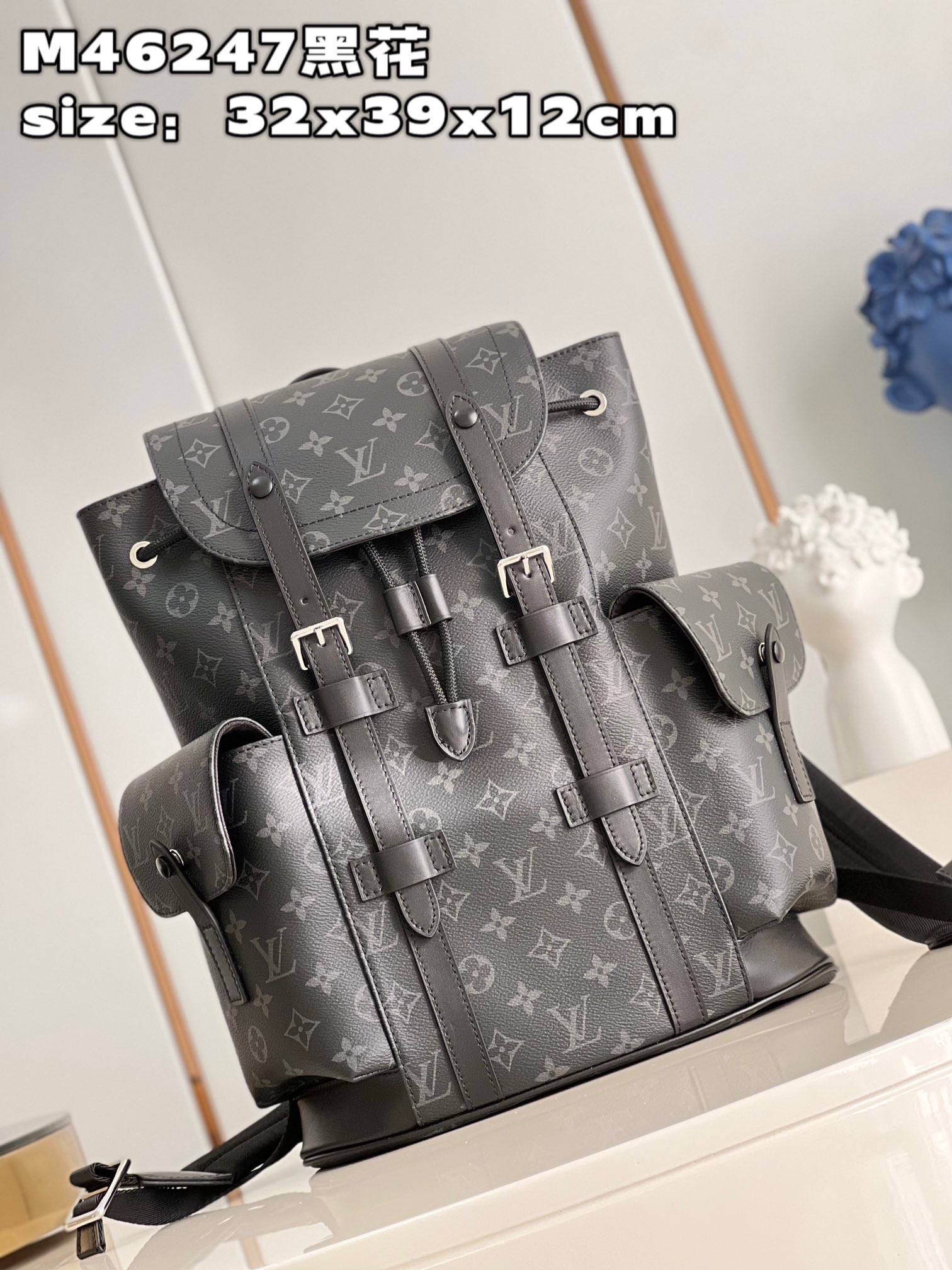 DetailP780 【 Exclusive live shot of M46247 black flower 】 M41379 small This Christopher small backpack combines Monogram eclipse reverse canvas and leather trim, presenting the rough texture of a hiking bag in a slightly smaller size. The side pocket is easy to access and store accompanying items, and a leather flip with a snap closure ensures secure storage. Dimensions: 32 x 39 x 12 cm (length x height x width)