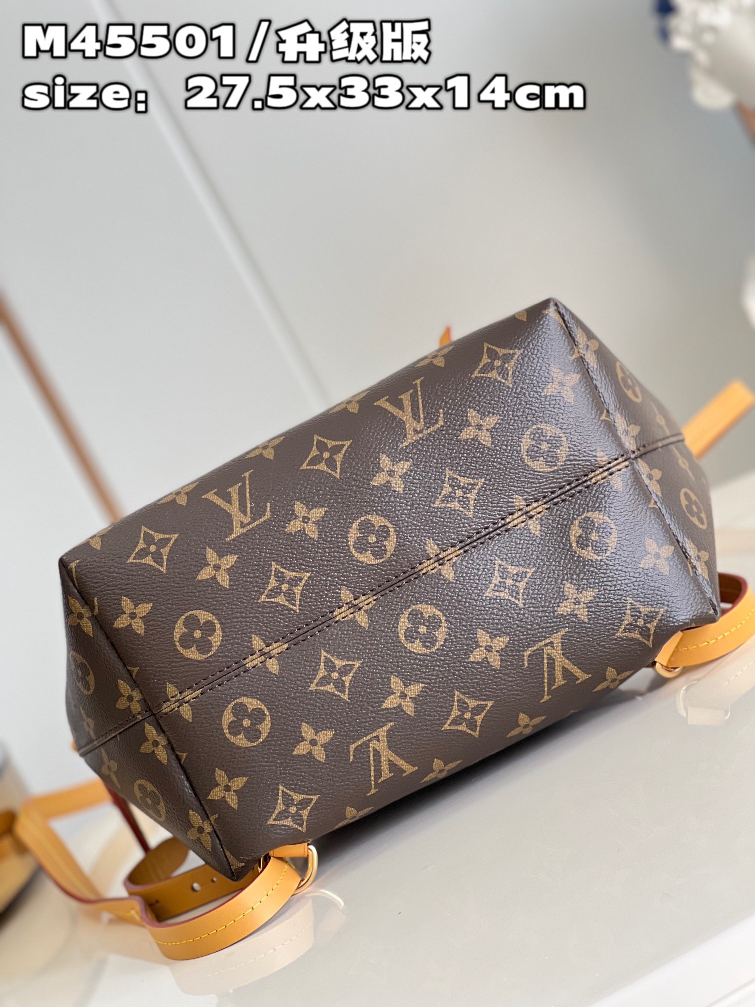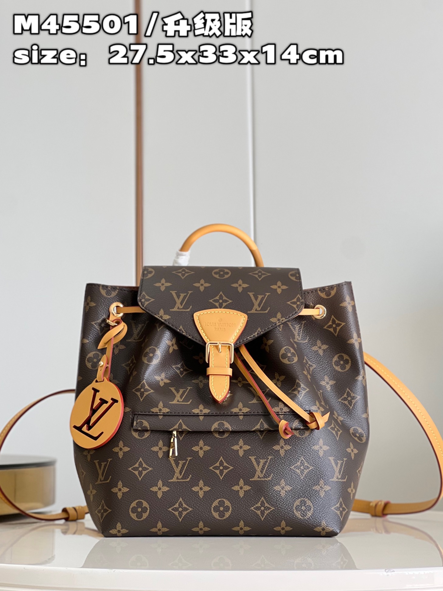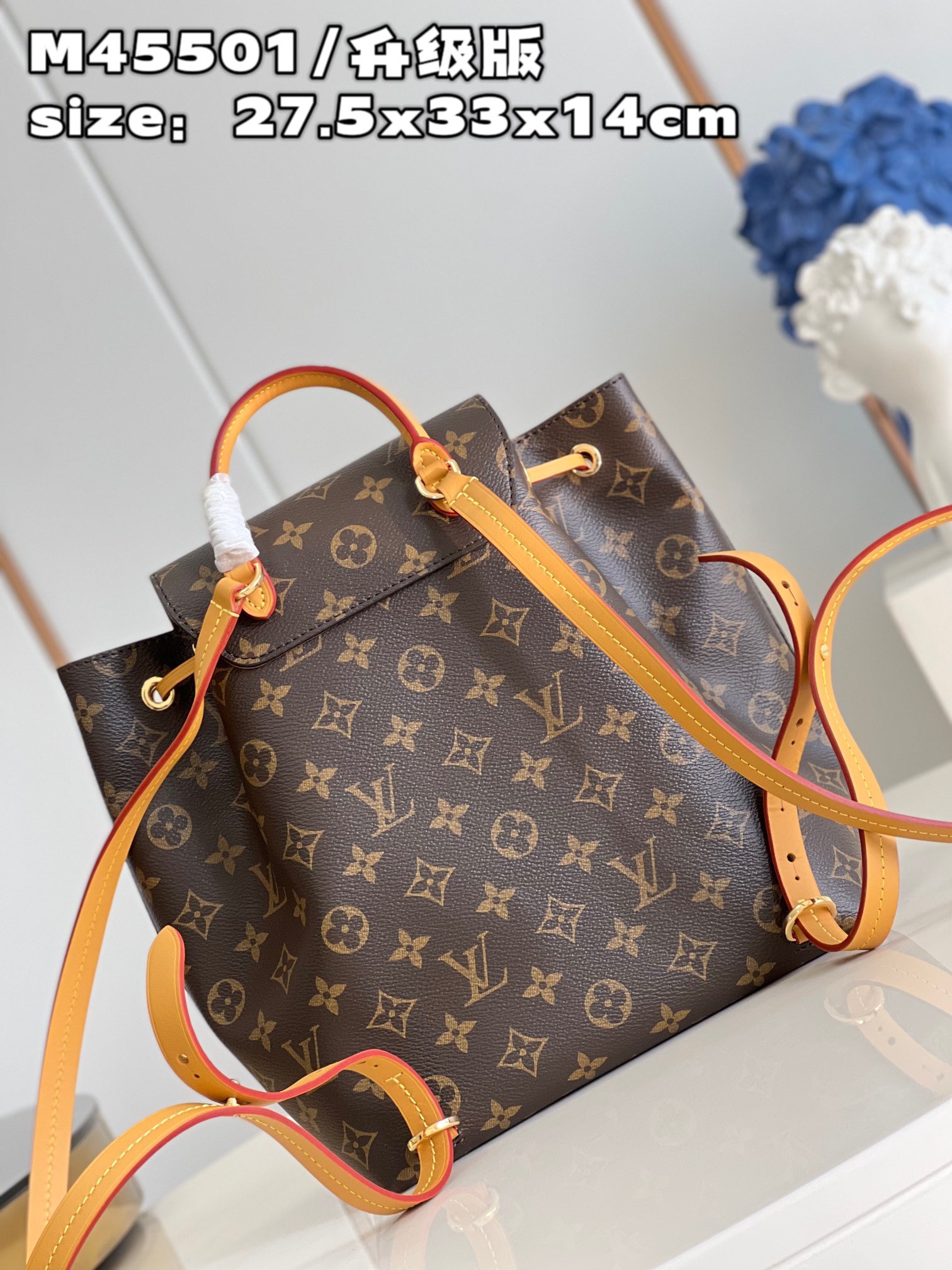 P780 【 Exclusive live shot m45501 upgraded version 】 The new montsouris small backpack is made of Monogram canvas and cow leather, paired with buckle and leather drawstring from the brand's archives. Abundant internal space and zippered outer pocket add functionality, with a top handle and detachable and adjustable leather shoulder straps for multiple carrying methods. Detailed features 27.5 x 33 x 14 cm (length x height x width)