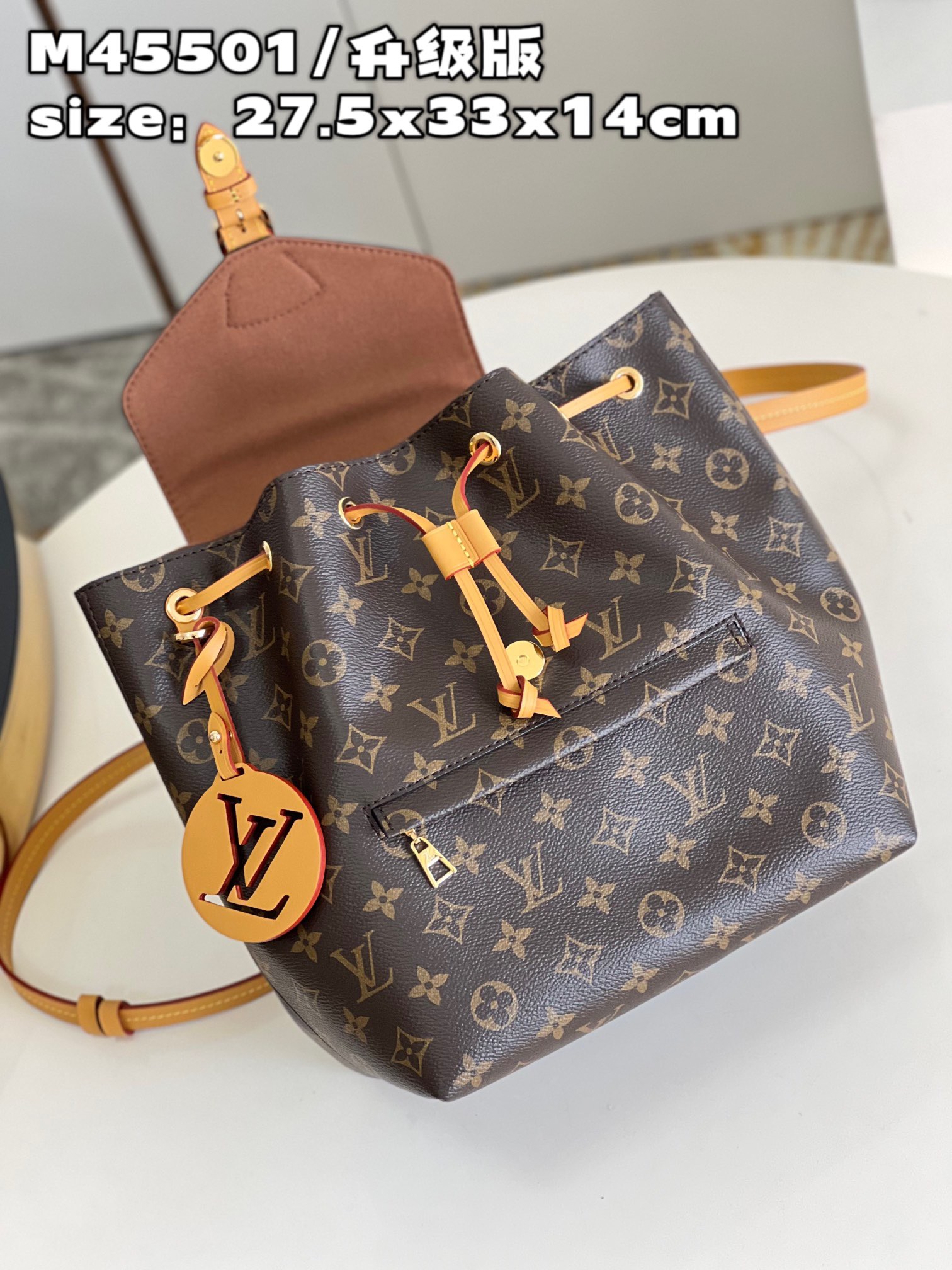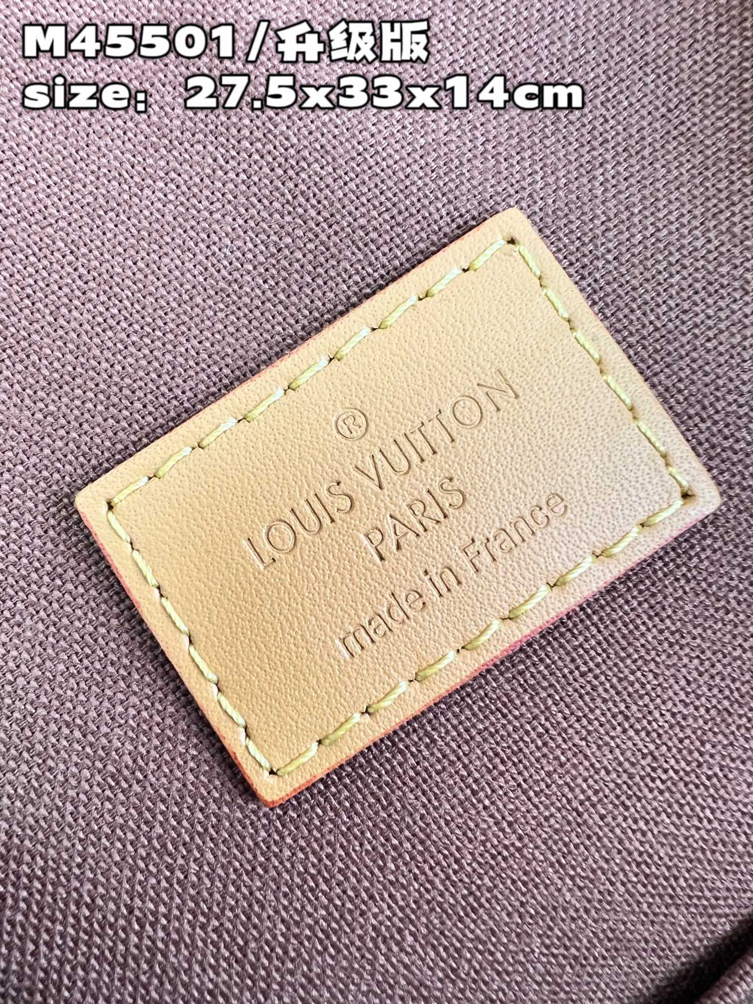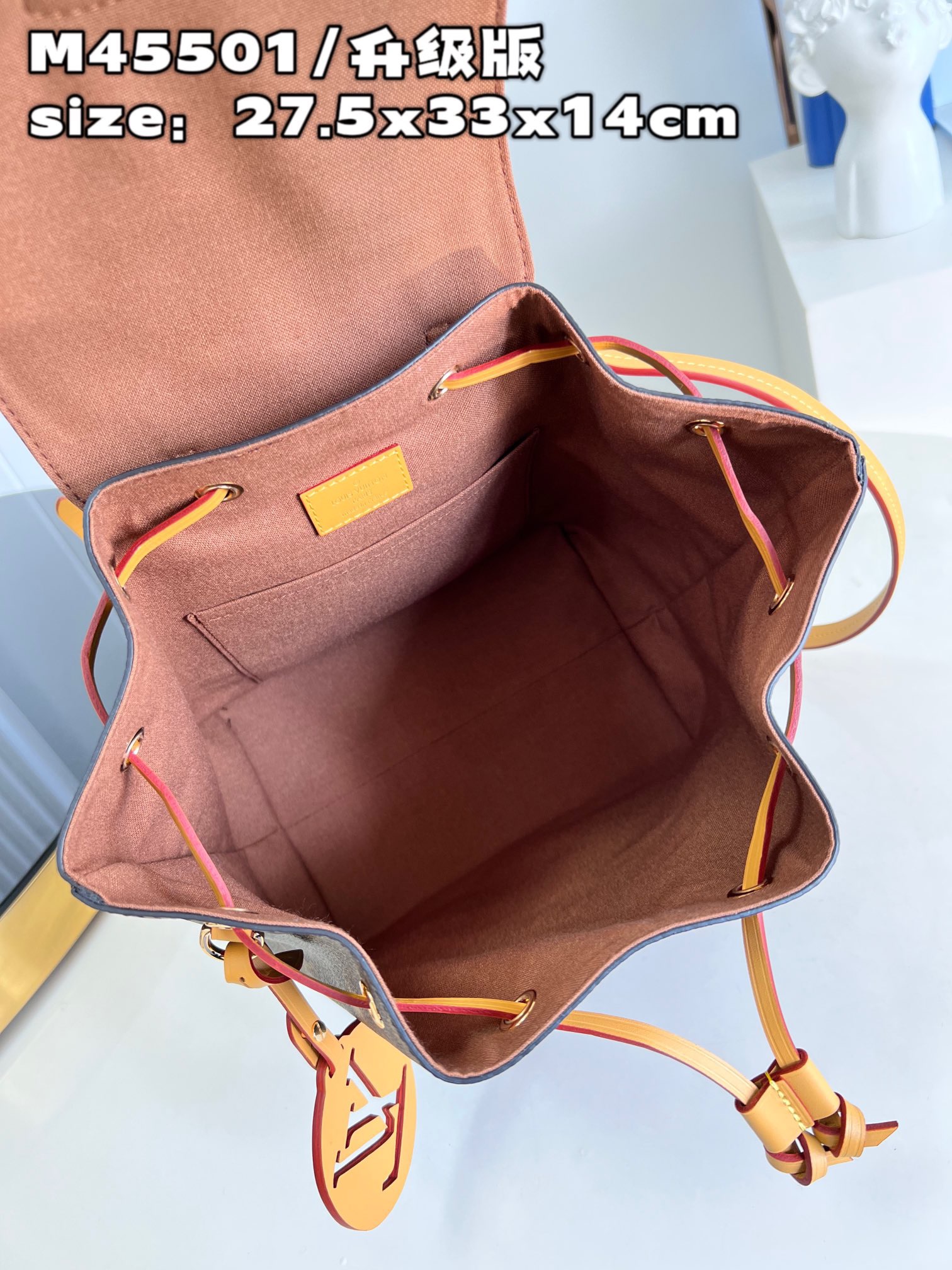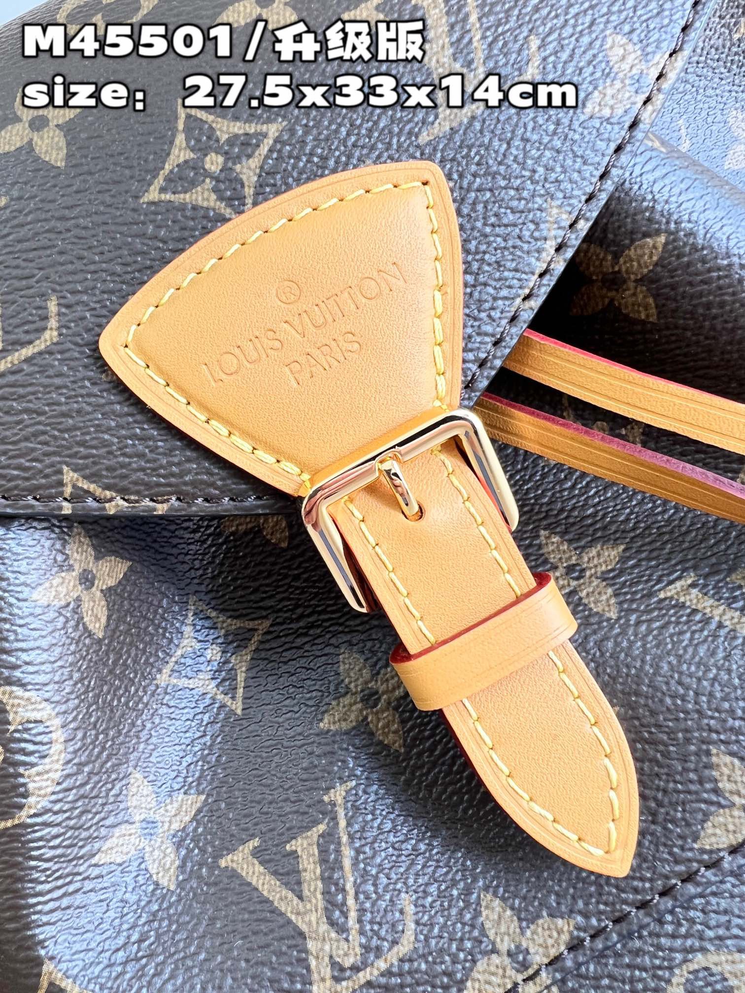 P780 【 Exclusive live shot m45501 upgraded version 】 The new montsouris small backpack is made of Monogram canvas and cow leather, paired with buckle and leather drawstring from the brand's archives. Abundant internal space and zippered outer pocket add functionality, with a top handle and detachable and adjustable leather shoulder straps for multiple carrying methods. Detailed features 27.5 x 33 x 14 cm (length x height x width)